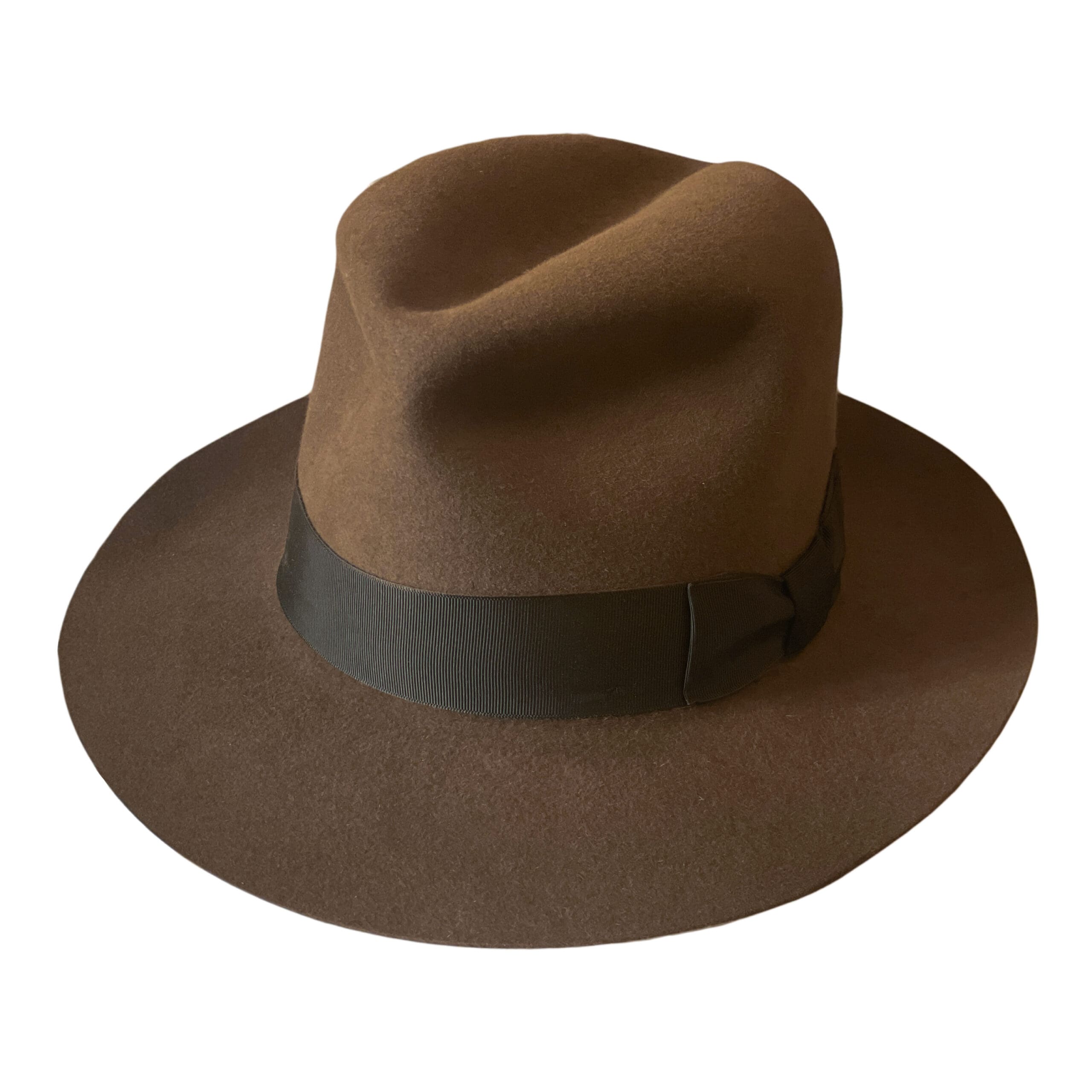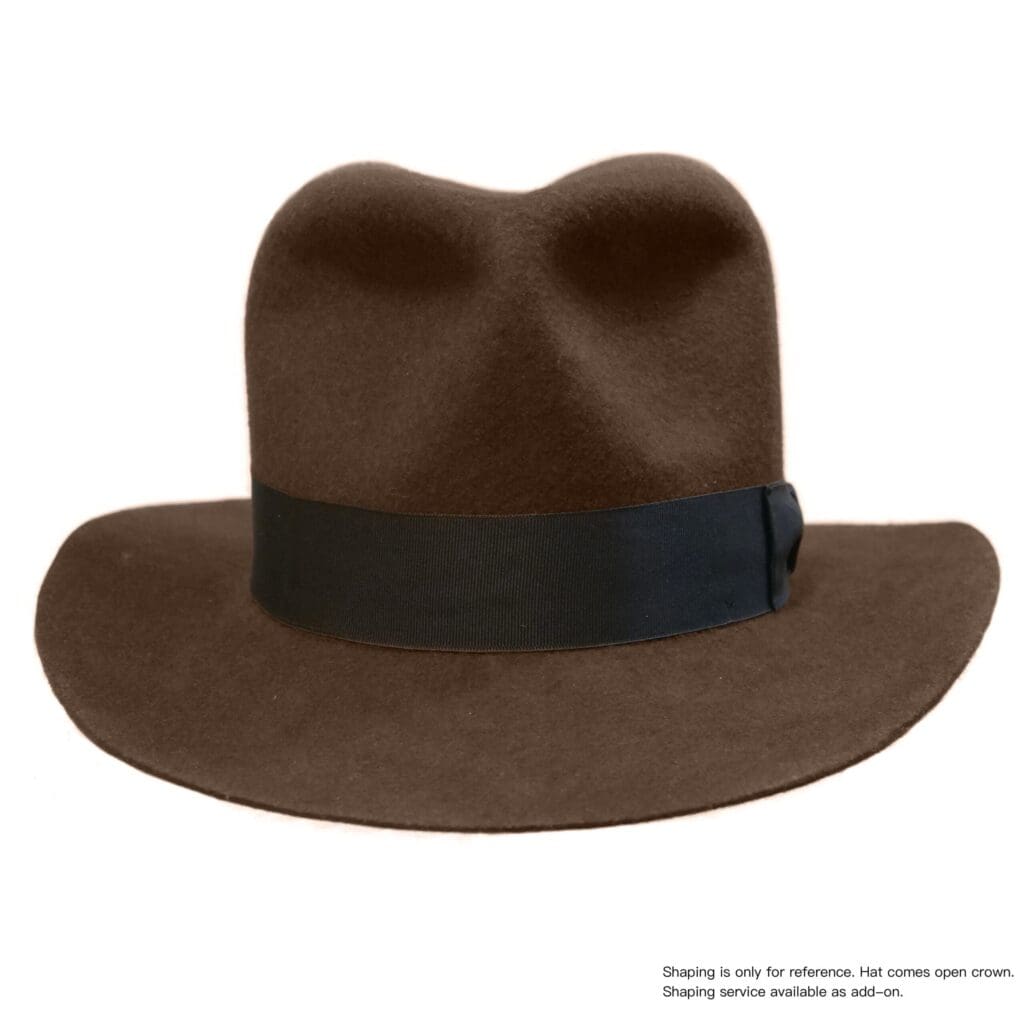 Step into a bygone era with the Hero Jr., an open crown fedora that allows you to recreate classic styles and shapes at an affordable price. In the past, many hats were sold “open crown,” meaning they hadn’t been shaped yet, leaving the creases or “bash” to be added by the hatter or customer. The Hero Jr. is named for its ability to make you feel like a hero while offering a quality hat at a “junior” price. The fedora has been a fashion staple since the 1920s and 1930s, worn by everyone from the average man to bankers or even archaeologists. During the 1930s, the open crown fedora was an everyday accessory for the average man. Over time, this style of hat has become a timeless symbol of elegance and adventure. This open crown fedora is not a replica of any individual hat but is made from existing hat blocks so people can recreate their favorite classic styles or make something entirely new! Currently, we only offer brown with dark brown ribbon, but we plan to offer other colors and styles in the future.